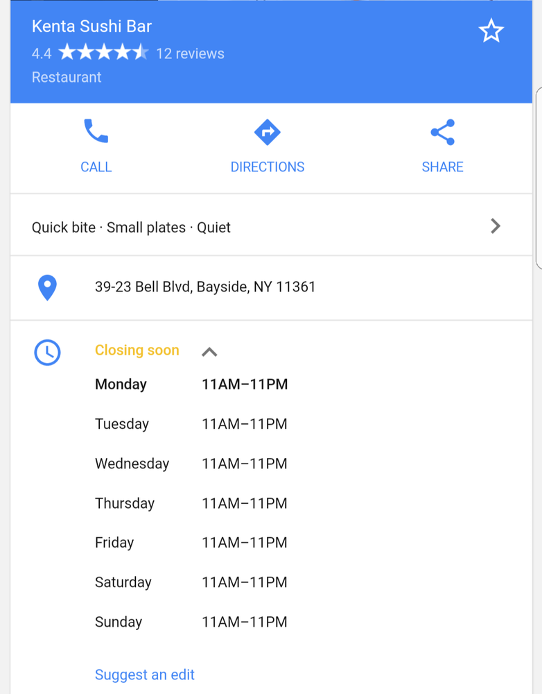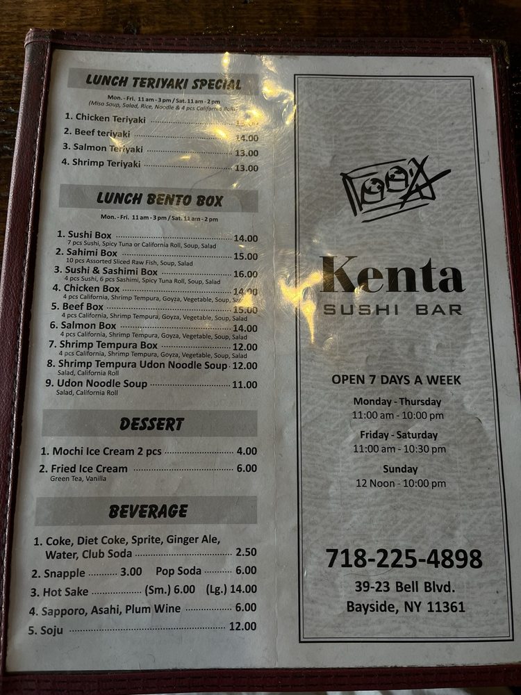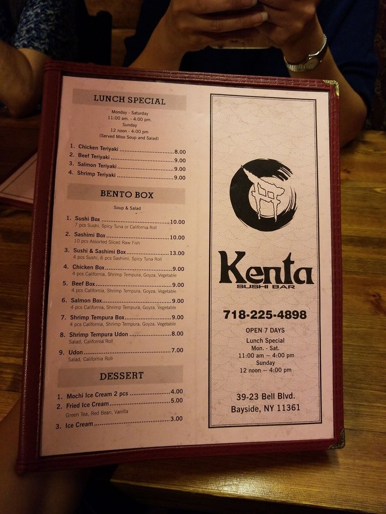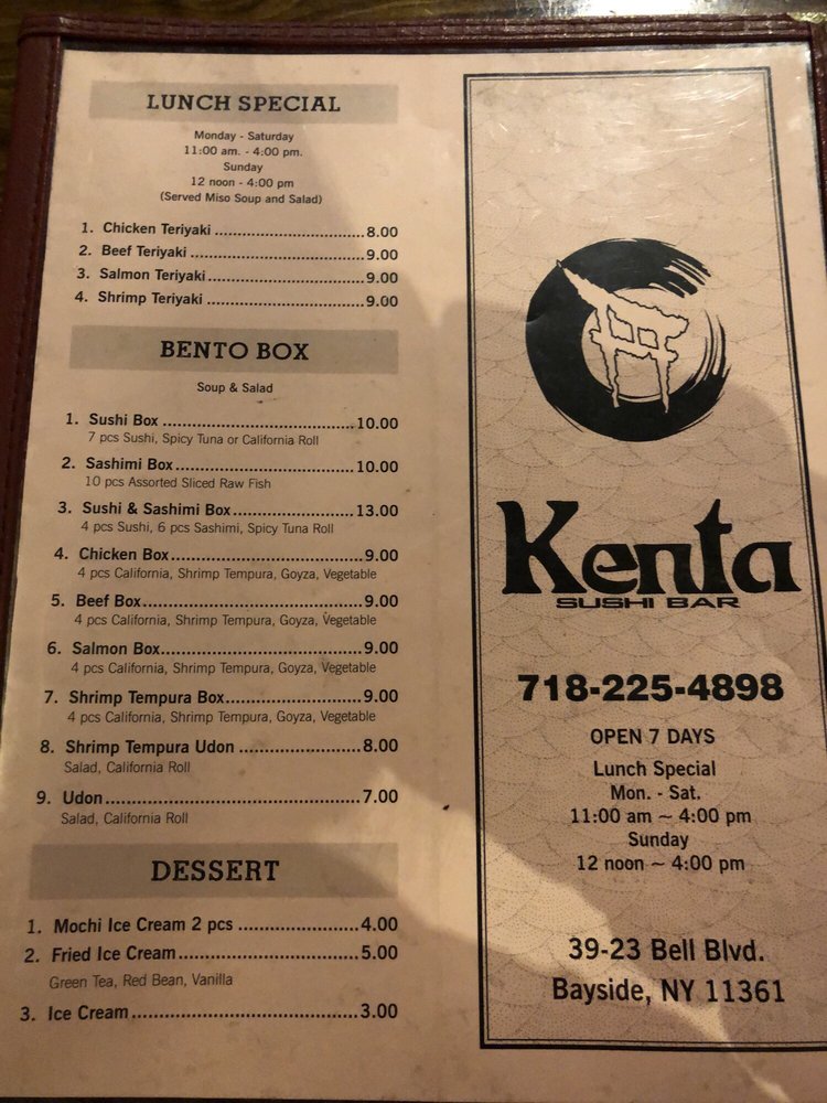 Kenta Sushi, located in Bayside, NY, offers a diverse selection of Japanese cuisine with a focus on fresh sushi. With a cozy and casual atmosphere, this restaurant is perfect for enjoying a quiet meal with friends or family. The menu features a wide range of rolls, from classic to specialty options, all made with fresh and flavorful ingredients. Customers rave about the quality and taste of the sashimi, sushi rolls, and special rolls like the Kevin Special Roll. The miso soup and house salad are also highly recommended. The attentive staff and reasonable prices make this hidden gem a must-visit for sushi lovers. Whether dining in or taking out, Kenta Sushi promises a satisfying and delicious experience for all.